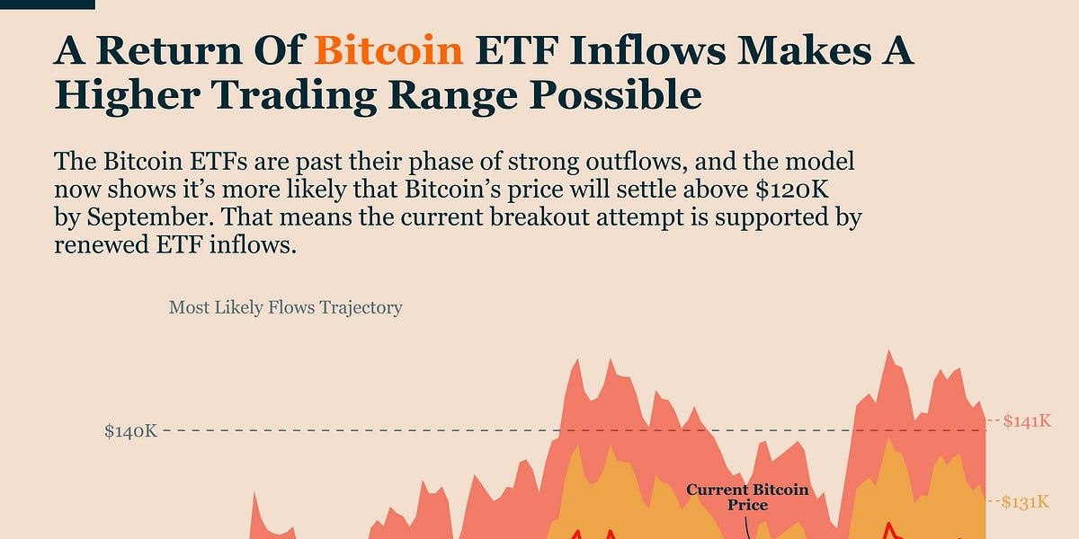 Bitcoin is getting more money from ETFs again, which is good news! This means people think its price might go up to between $111,000 and $131,000 soon. Ethereum, another cryptocurrency, is also starting to do better as more people invest in its ETFs. But there’s a worry about rising prices in the economy, which makes it tricky for the people in charge of money to decide what to do next.