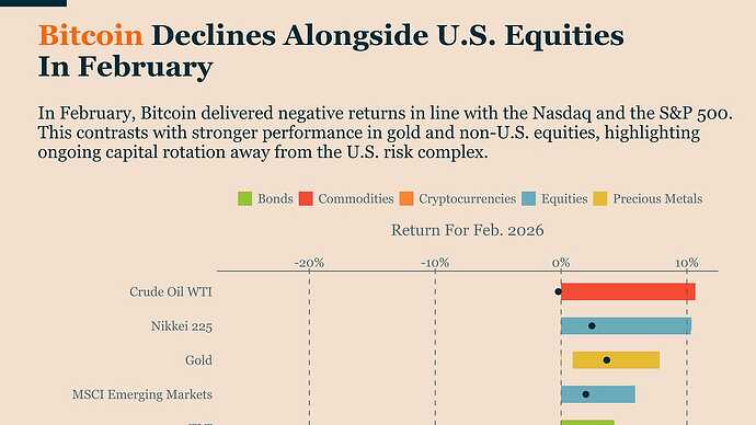 The article discusses how Bitcoin’s behavior changes depending on market conditions. In strong bull markets, Bitcoin tends to lead, attracting capital and reflecting a strong global risk appetite. However, in the current risk-off environment, Bitcoin is not acting as a defensive asset; instead, it mirrors the performance of high-beta tech stocks, amplifying the overall market’s weaknesses. This shift is particularly evident as U.S. equities stall and investors rotate towards safer assets like gold and commodities.