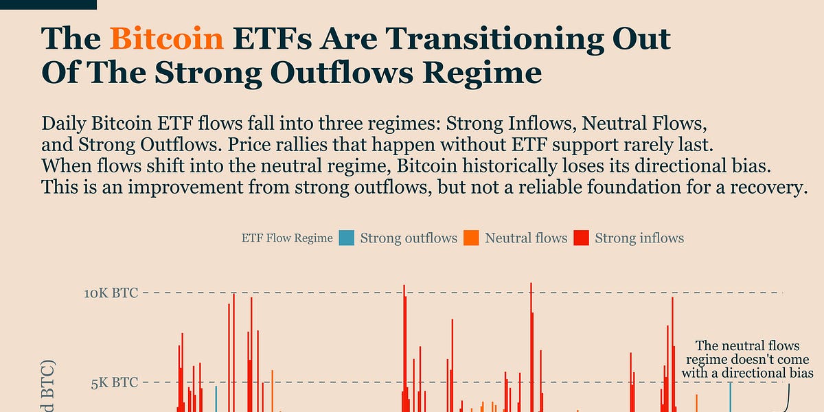 The article discusses Bitcoin’s recent transition out of a strong outflows regime, which had caused significant price drops due to a feedback loop of ETF outflows. This loop saw Bitcoin’s price fall sharply, triggering further selling pressure. However, the latest data indicates that Bitcoin has moved into a neutral flow regime, breaking the cycle of forced selling. While this is a positive development, it does not yet signal a full recovery, as historically, neutral regimes do not correlate with strong price increases.