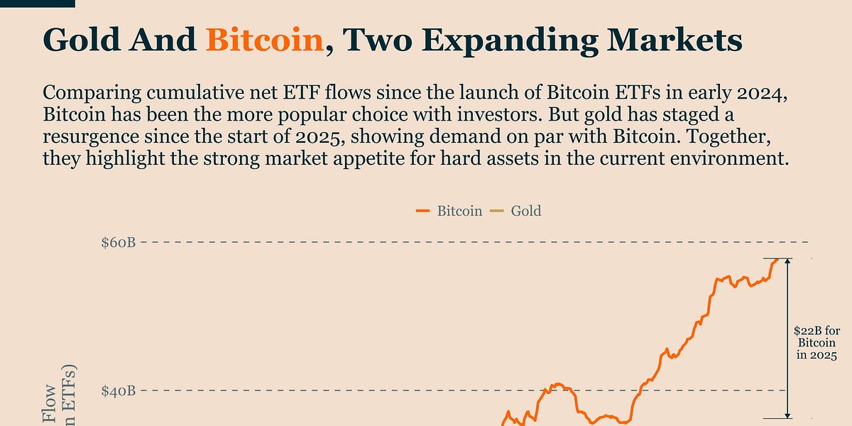 The article discusses the evolving narrative around Bitcoin and gold, traditionally viewed as competitors in the financial market. It argues that rather than one asset replacing the other, both are experiencing a simultaneous rise in demand. This shift indicates that the market for hard assets is expanding, rather than merely redistributing capital from gold to Bitcoin.