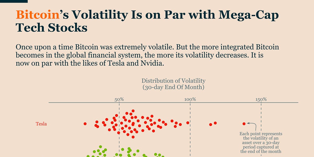 The article also compares Bitcoin’s volatility to that of major tech stocks, showing that Bitcoin is no longer an outlier in terms of volatility. In fact, assets like Nvidia and Tesla have shown higher volatility than Bitcoin in recent years. This suggests that Bitcoin has matured and is now in the same risk category as other mainstream assets.