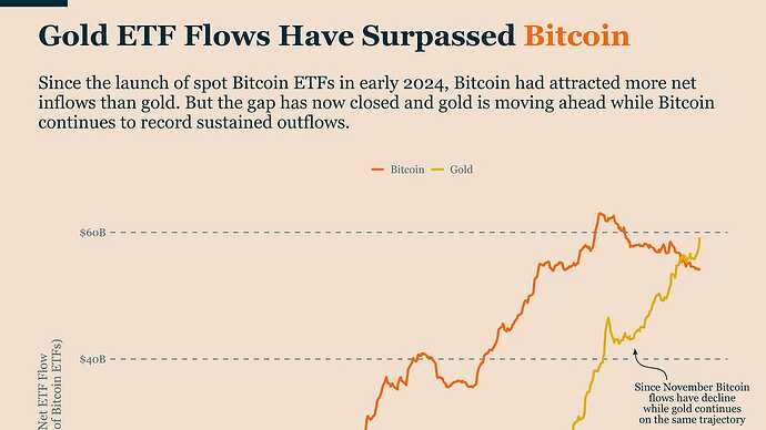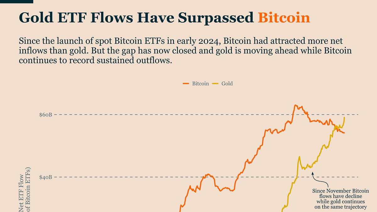 Gold ETF flows have surpassed Bitcoin, indicating a shift towards more defensive investments.