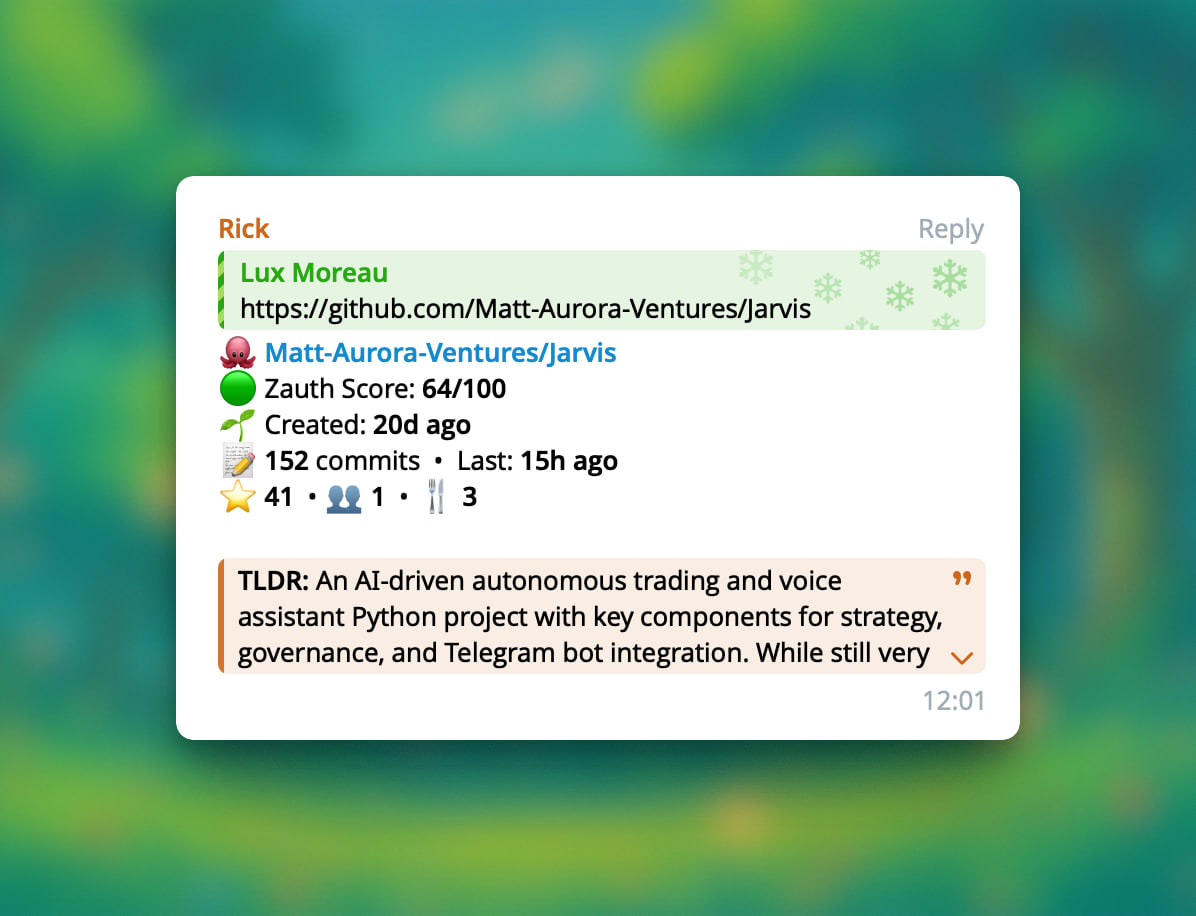 Post a Github repo for quick insights, powered by Zauth. Alternatively, use the /git command.