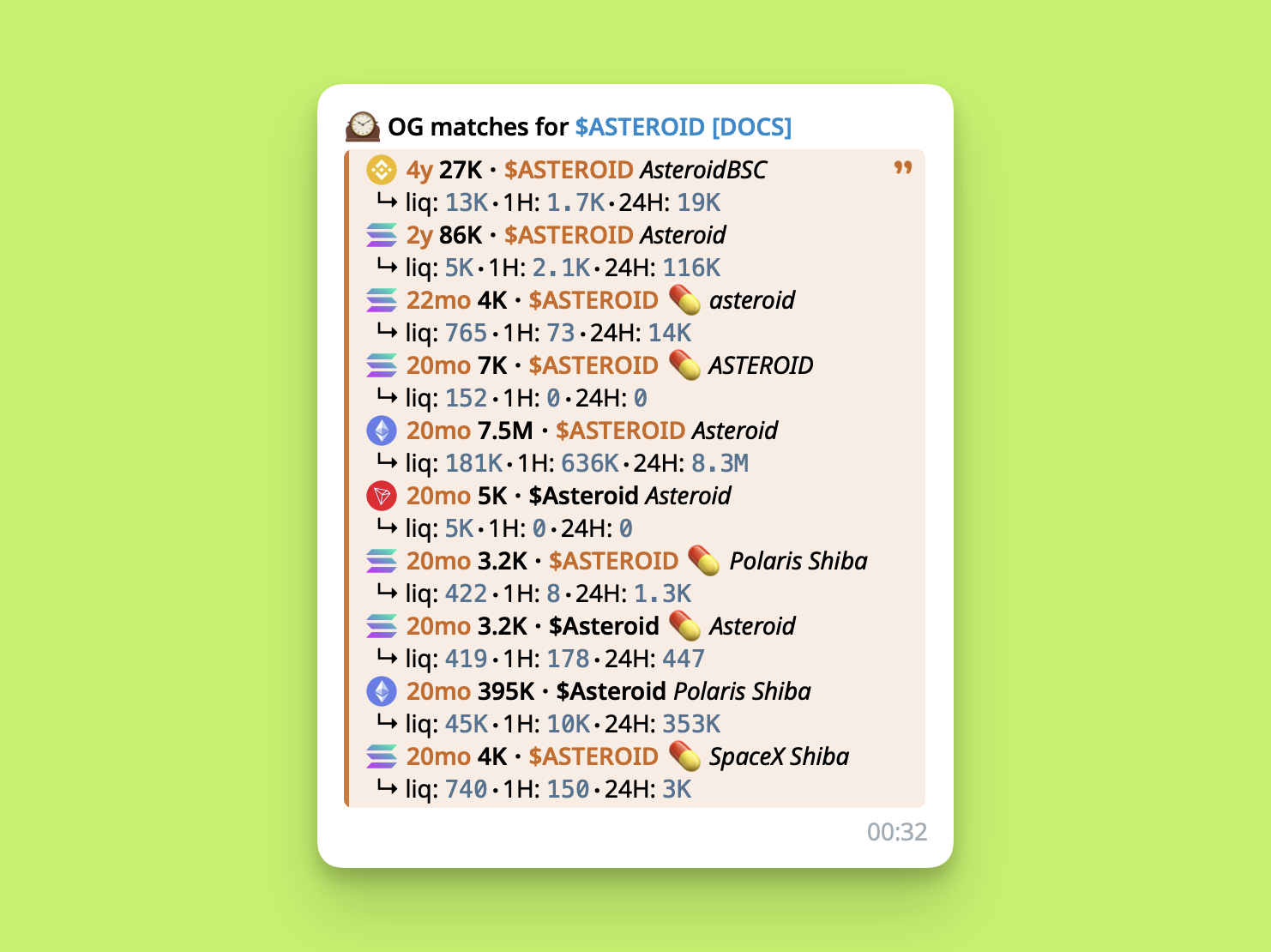 /old <symbol>- list the oldest tokens matching that symbol/name/old <address>- resolves the address to its ticker, then lists OGs sharing it