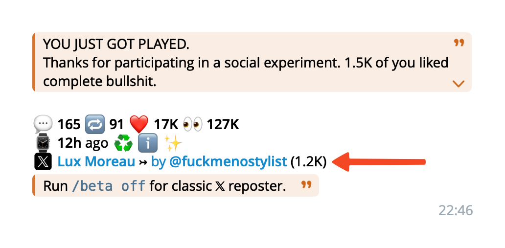 The classic 𝕏 reposter will remain supported, and you can switch back to classic mode with /beta off.