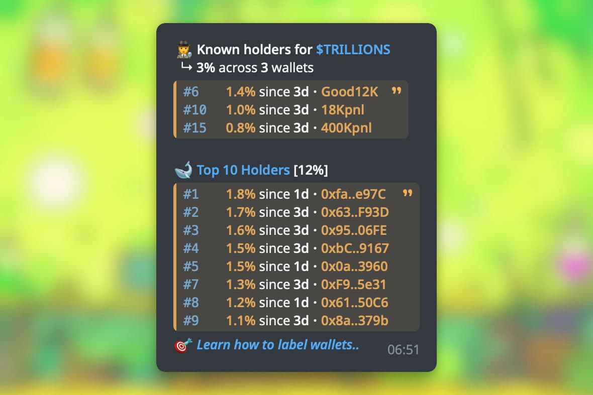 Introducing Known Holders. Instantly identify any tracked wallet in the top 200 holders any token. If no wallets are known, it simply shows the top 10 holders. When used in DMs, the top 15 is shown.