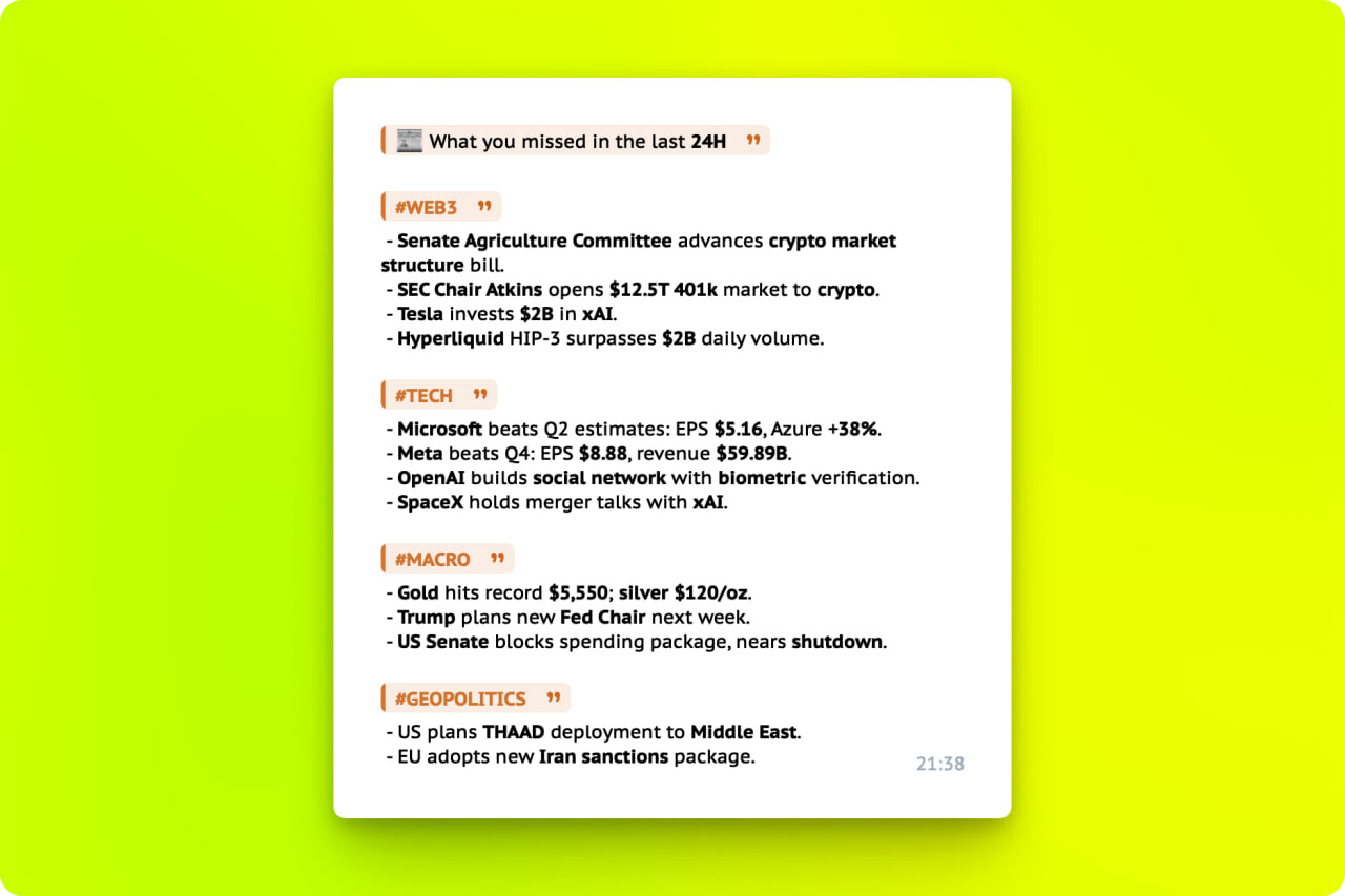 On Telegram, you can use /news 24h to get a news recap. Works up to 31d. Use /news br for breaking news only.
