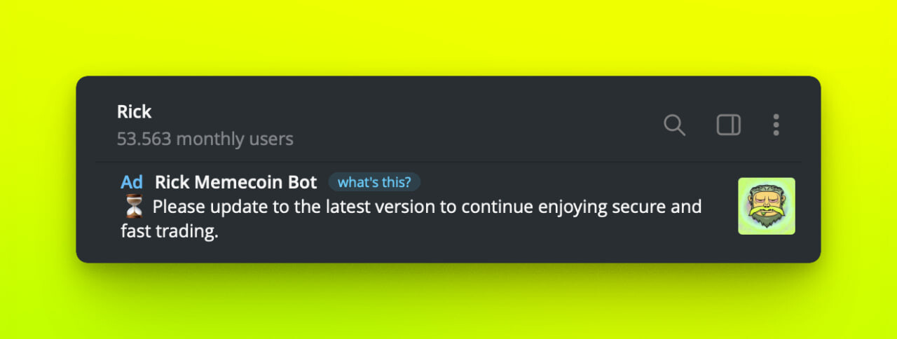 [!warning] Do not fall for malicious ads[1] on Rick. Rick goes by @rick or @RickBurpBot. Any other handle is a scam.