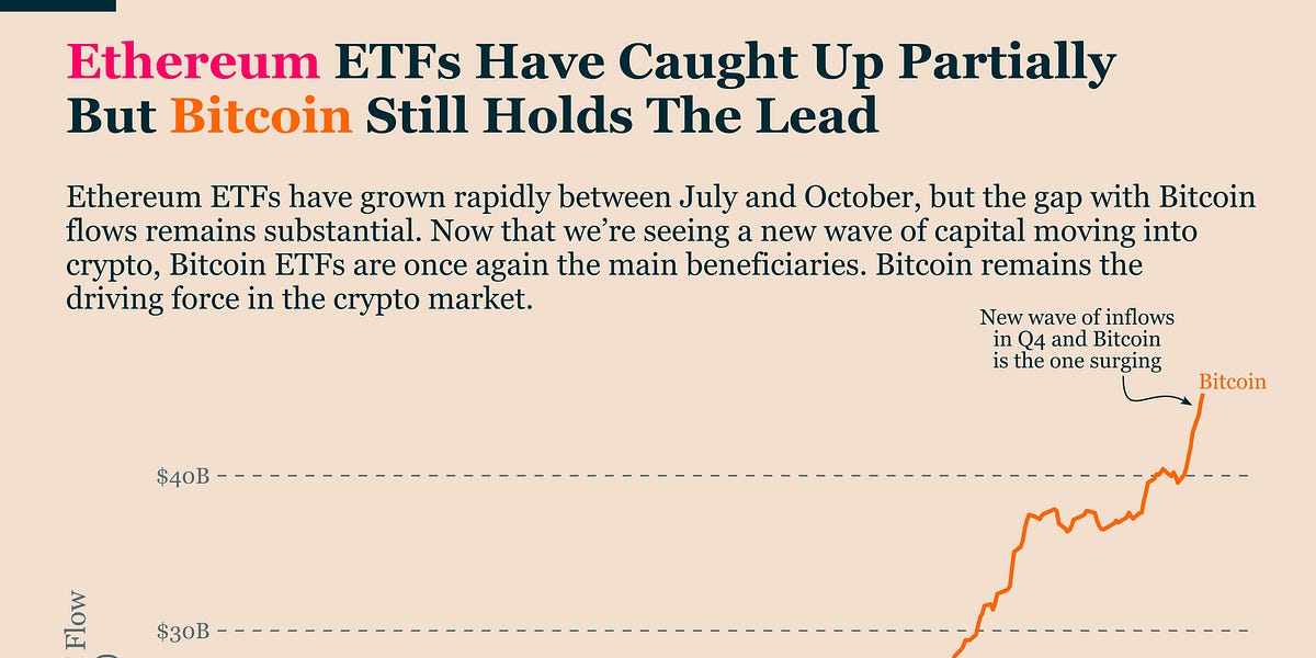 The article discusses the recent surge in Bitcoin’s popularity, highlighted by a remarkable $1.2 billion in ETF inflows on a single day, marking a significant moment for the cryptocurrency. This trend suggests that Q4 is likely to see a rotation into crypto and hard assets, as institutional investors are increasingly looking to Bitcoin as a primary investment vehicle. The article emphasizes that while Ethereum is also seeing renewed interest, it still lags behind Bitcoin in terms of total inflows, indicating that Bitcoin continues to be the dominant choice for institutional capital entering the crypto space.