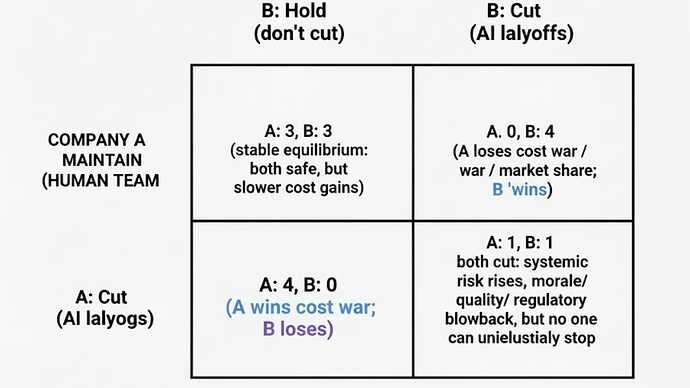 Imagine a game where everyone has to decide whether to keep their jobs or let robots do the work. If everyone chooses robots to save money, many people will lose their jobs, and then nobody will have money to buy things. This could make businesses earn less money, and eventually, the whole economy could crash. It’s like a big team game where if one person makes a bad choice, everyone loses! ![]()