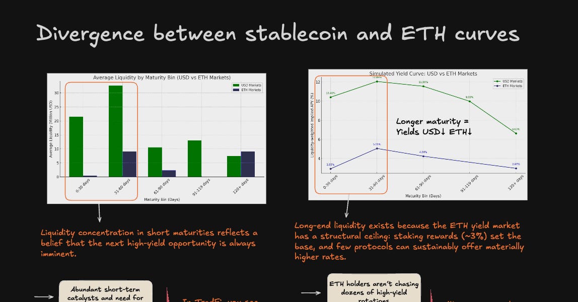 The divergence in yield curves indicates different market strategies: stablecoins favor flexibility, while ETH holders prioritize stability.