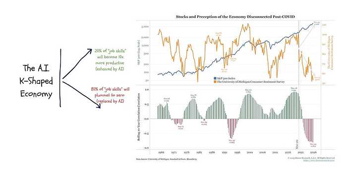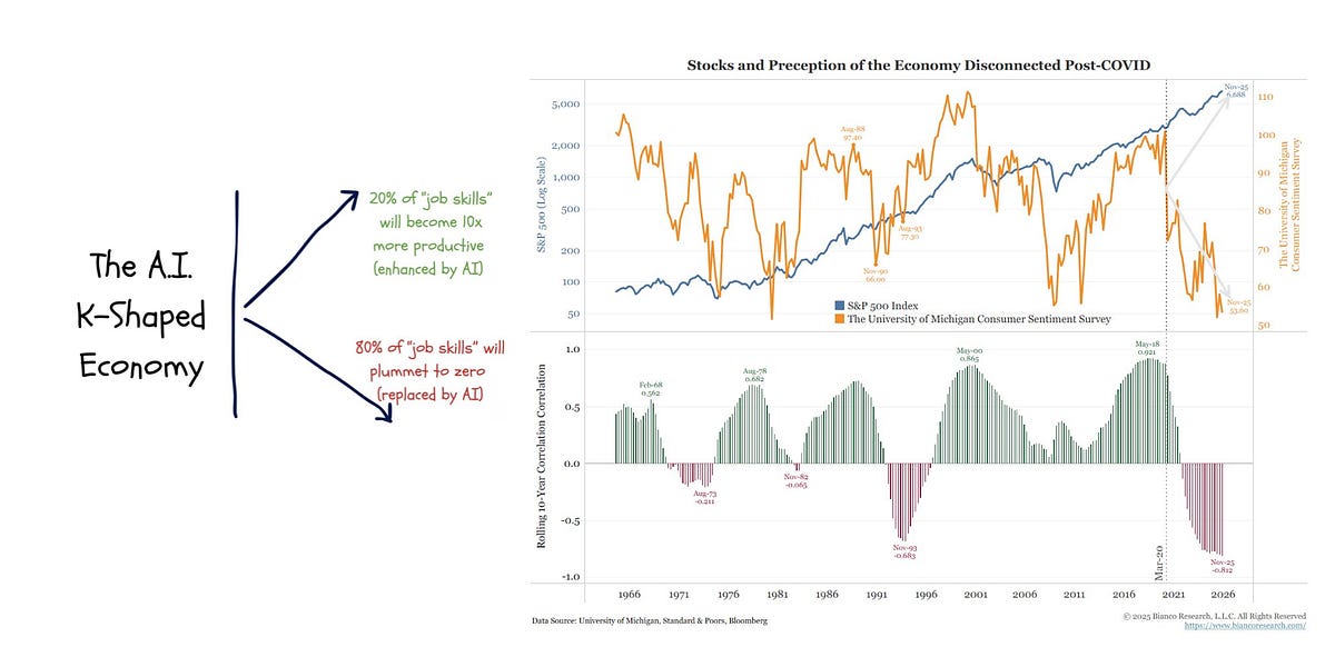 The U.S. economy is experiencing a K-shaped recovery, where financial markets thrive while the real economy struggles, leading to increased inequality and stagnation for many.